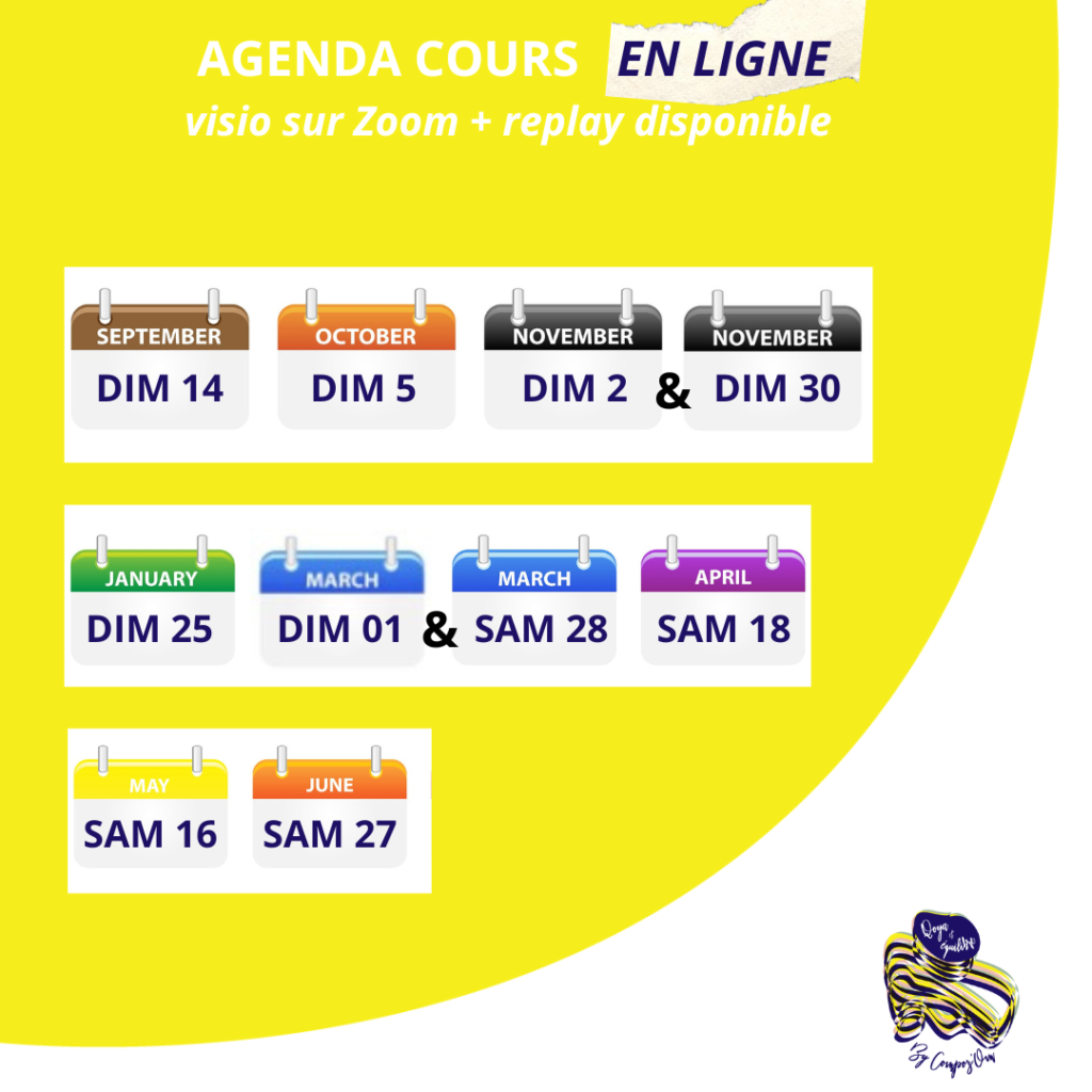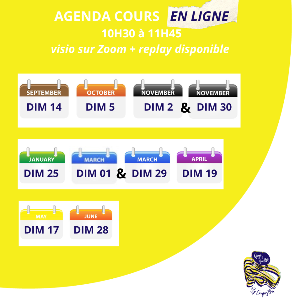 Cours d’1h15 de 10h30 à 11h45 une fois par mois.